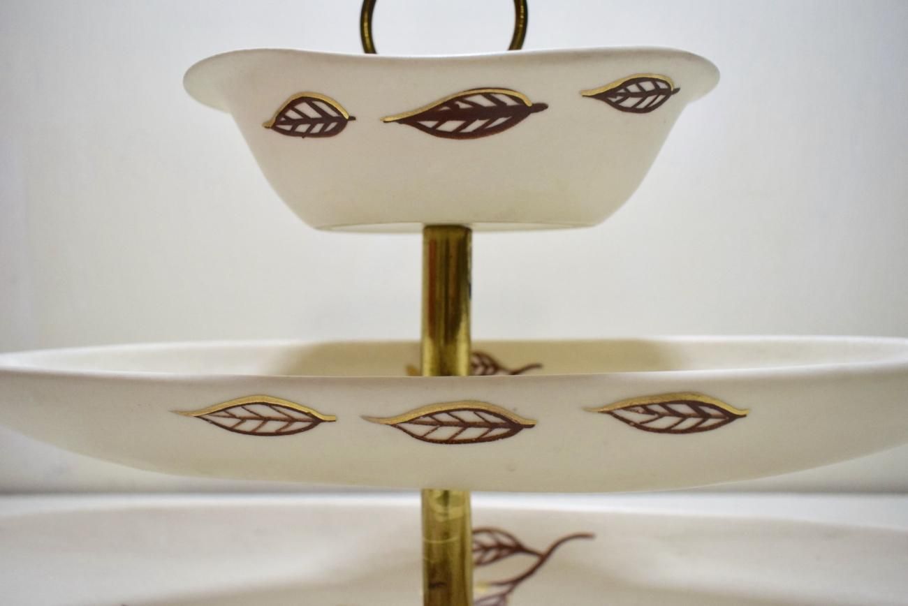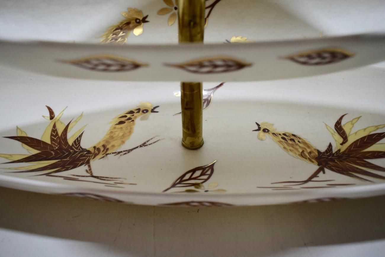 ゴールドの鶏が描かれた3段のオーバル型ケーキスタンドです。