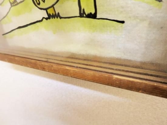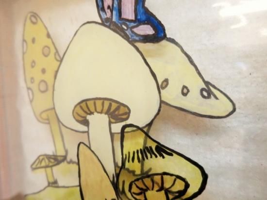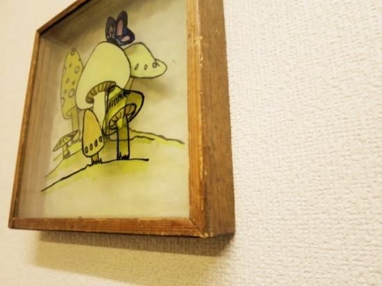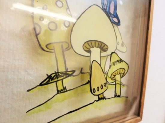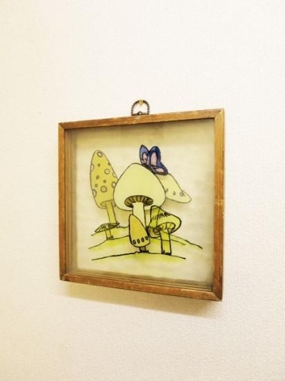 3枚のガラス板に様々なキノコが描かれており、小さな額の中に奥行が表現されています。